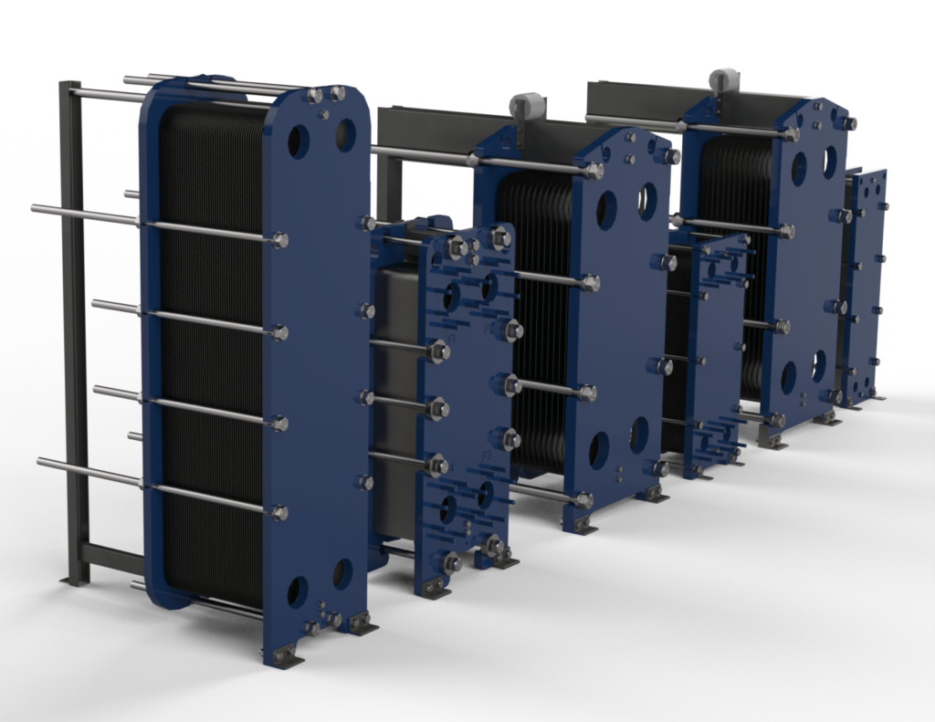 • Plate & Frame Heat Exchangers consist of a series of corrugated plates that create alternating hot and cold channels.